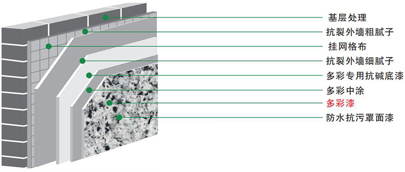 建議配套產(chǎn)品:多彩專用抗堿底漆一遍,多彩中涂一遍,多彩漆兩遍(建議涂裝道數(shù)),專用罩光面漆一遍。